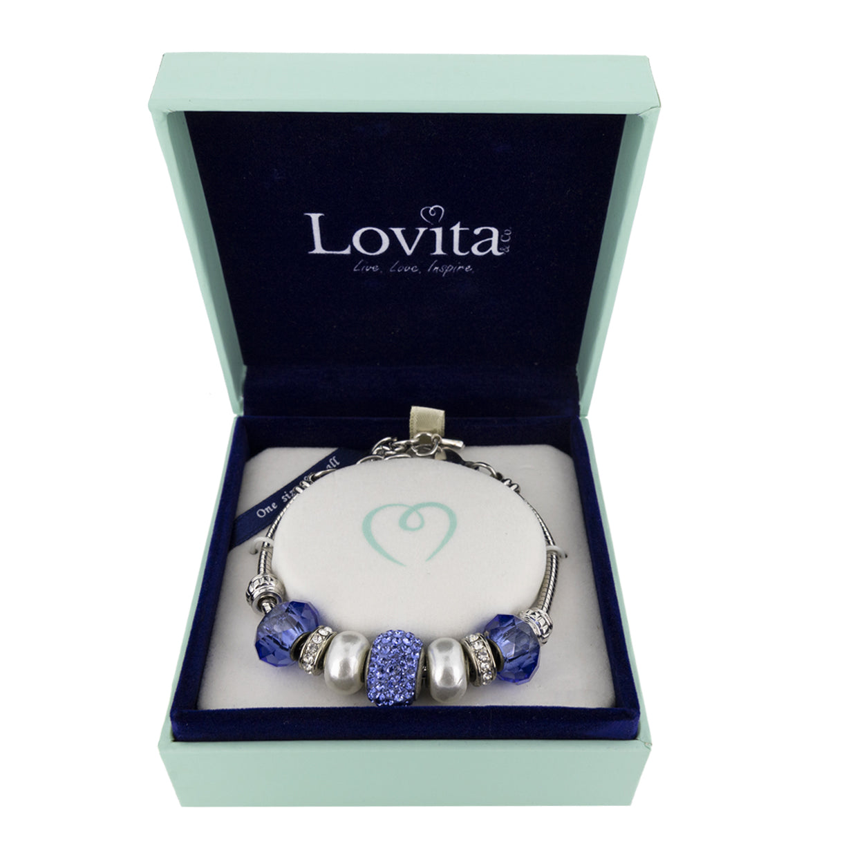 Adorn your wrist with the captivating Lovita Charm Bracelet, a symphony of blue crystals and lustrous charms. Each charm is meticulously selected, featuring deep blue faceted crystals, shimmering pavé beads, and polished silver-tone accents that harmoniously blend for an enchanting finish. The flexible silver-tone snake chain with a secure lobster clasp provides both comfort and style, promising a snug fit for any occasion.