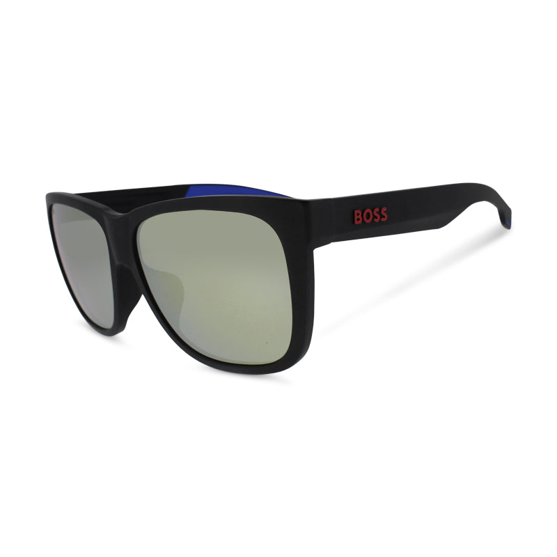 Hugo Boss Matte Black Blue Sunglasses are designed to make a bold statement. Crafted with acetate, these full-rim square sunglasses feature a matte black and blue frame.