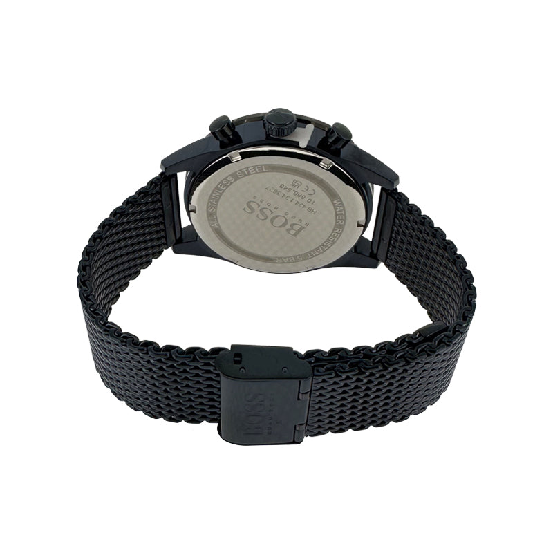 Sleek Hugo Boss men's watch. Crafted with stainless steel, featuring a blue metal mesh strap and a striking blue dial.