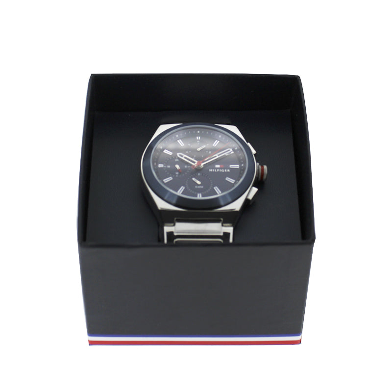 Stylish men's Tommy Hilfiger watch. With its stainless steel case, silver strap, and blue dial, this analogue timepiece features a chronograph, quartz movement, and 50M water resistance. Complete with a 44mm case and folding clasp.