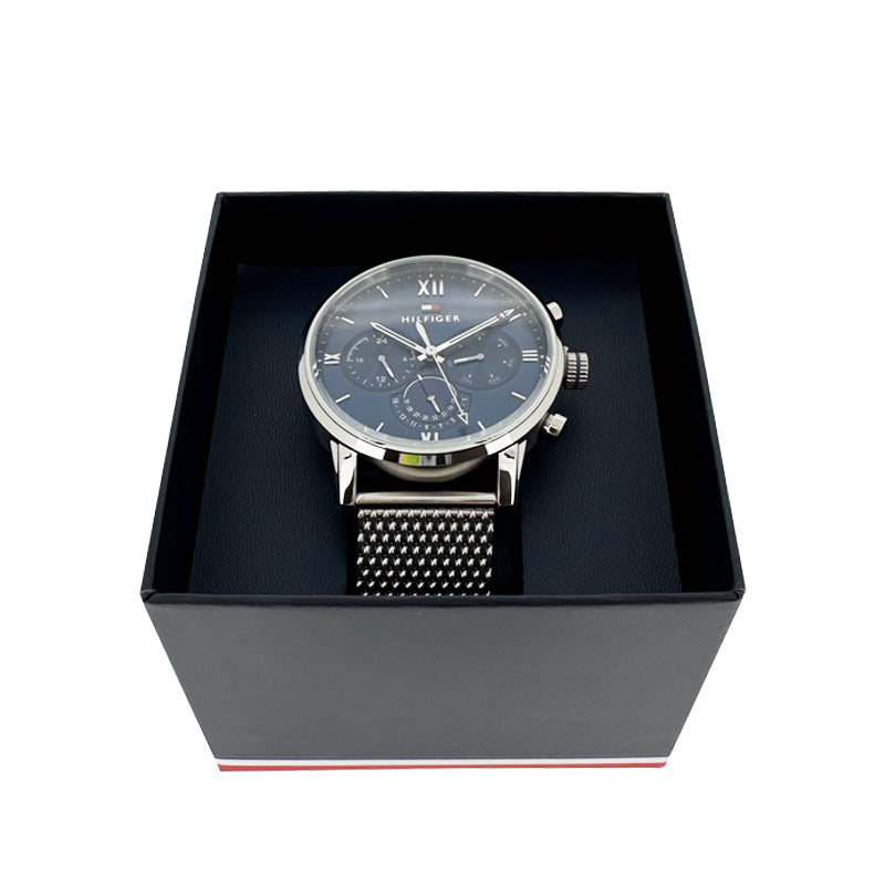 Sleek Tommy Hilfiger watch for men: a stainless steel masterpiece with a silver metal mesh strap, a captivating blue dial, and precise quartz movement.