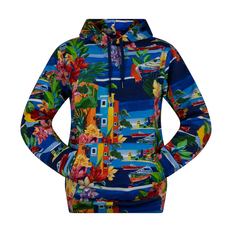 Elevate your casual wardrobe with the Polo Ralph Lauren Fleece Pullover Men's Hoodie. Crafted to blend comfort and style, this hoodie is perfect for laid-back days or transitioning between seasons. Offering a blend of elegance and practicality, it features a vibrant seaside vista design, reminiscent of the French Riviera, adding a painterly touch to your outfit.