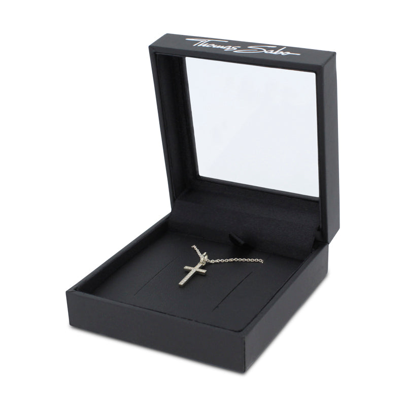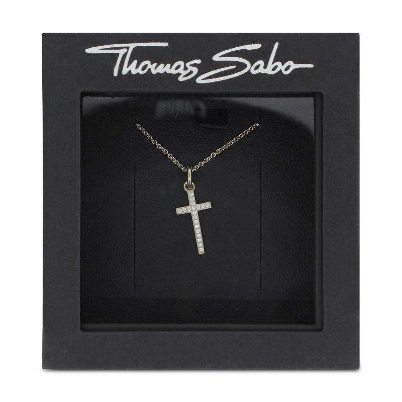 This Thomas Sabo necklace showcases a sleek silver cross, crafted from 925 Sterling Silver. Adorned with white zirconia stones, it adds a touch of elegance and sparkle.
