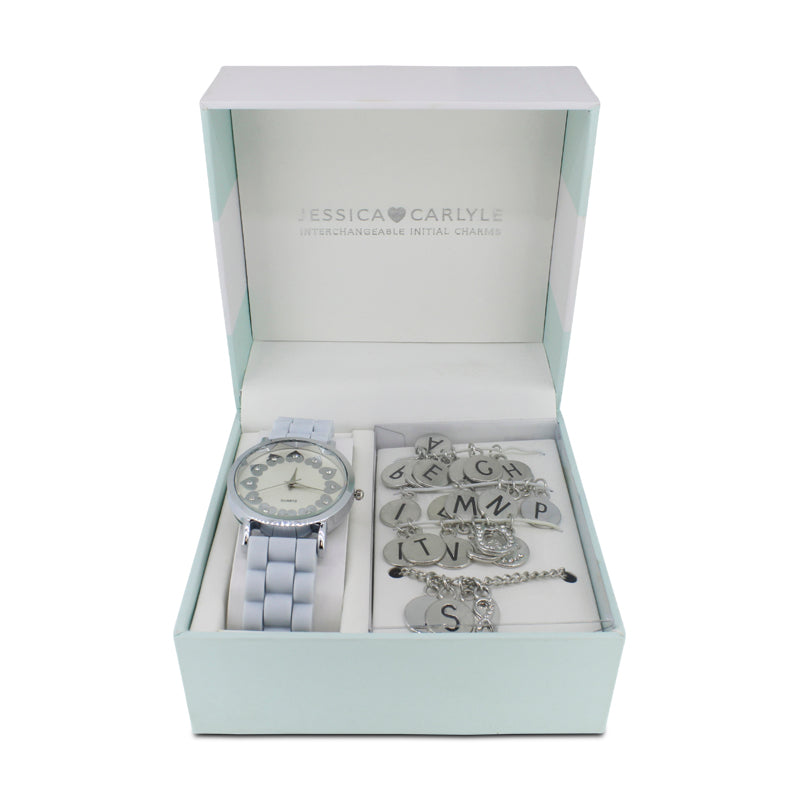 Jessica Carlyle Light Blue Rubber Strap Silver Watch & Bracelet With Initial Charms Set 1891 (Blemished Box)