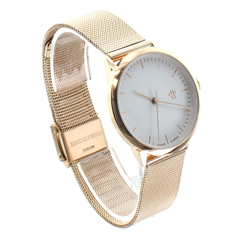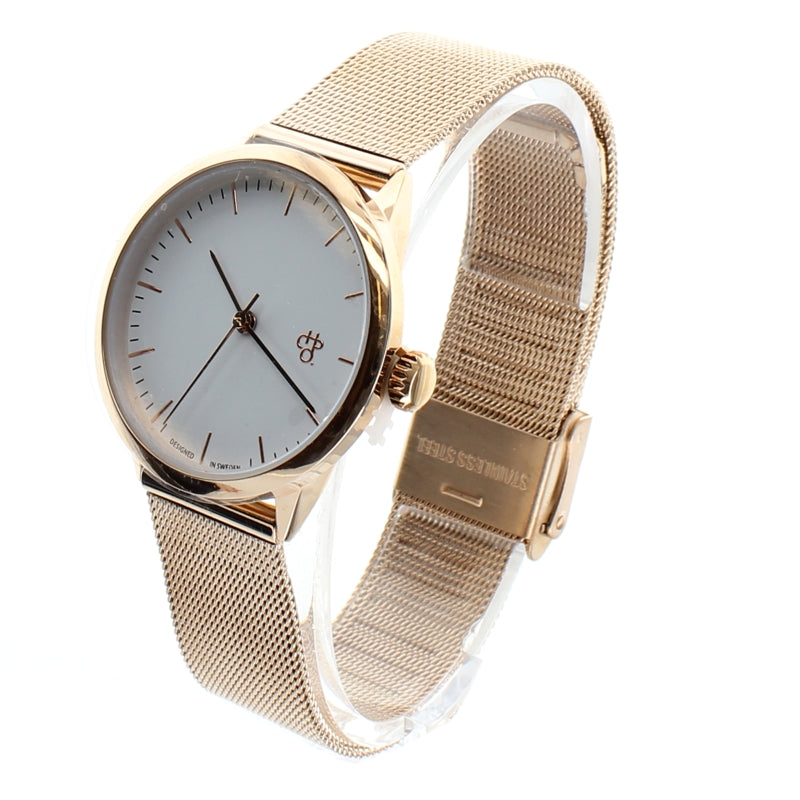 A stylish ladies watch from Chpo, featuring rose gold colour mesh strap and case, brand logo on white face dial.