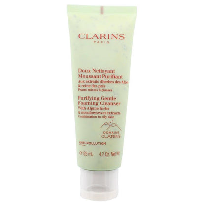 Clarins Purifying Gentle Foaming Cleanser is a creamy facial wash for oily skin. Enriched with Alpine herbs, Organic Saponaria, Meadowsweet extract, and salicylic acid granules, it effectively removes impurities, makeup, and pollution, leaving skin refreshed and shine-free.