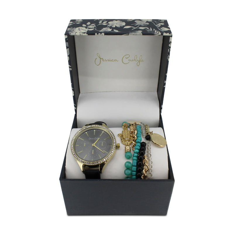 Jessica Carlyle Black & Gold Crystal Watch And Bracelet Set 2494