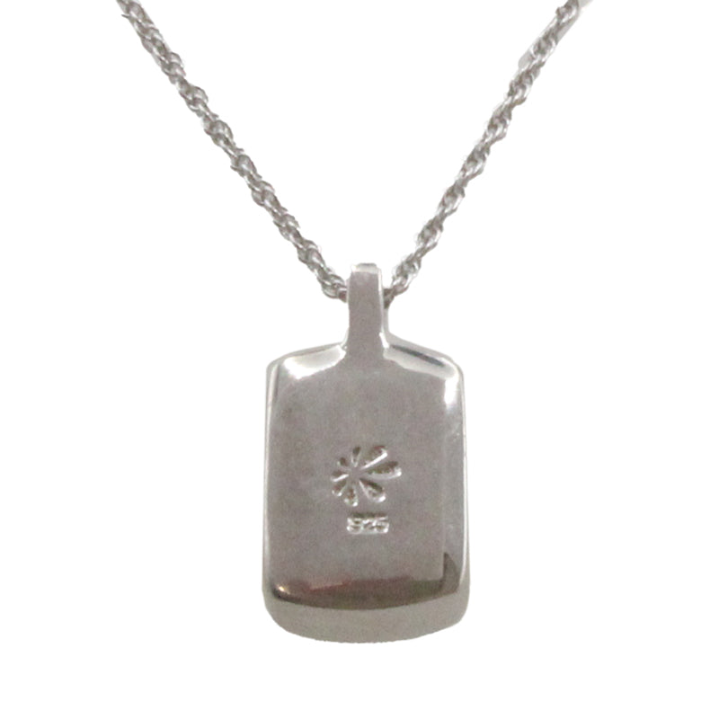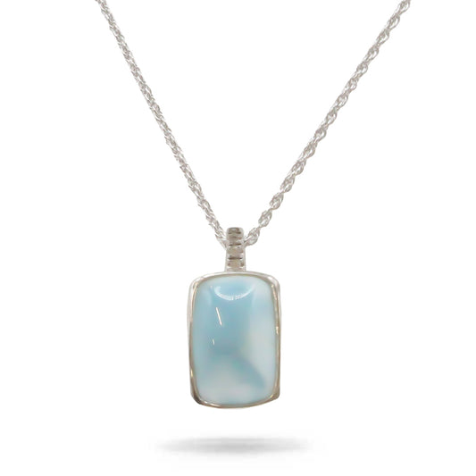 A beautifully detailed sterling silver necklace featuring a silver wrapped rectangle of Larimar gemstone, including white sapphires, a gentle and classic reminder of the cool Caribbean ocean breeze.