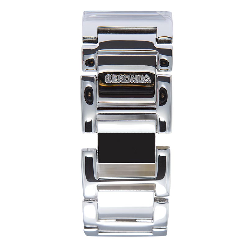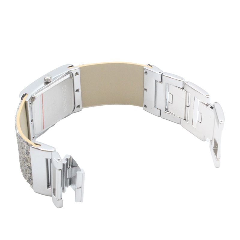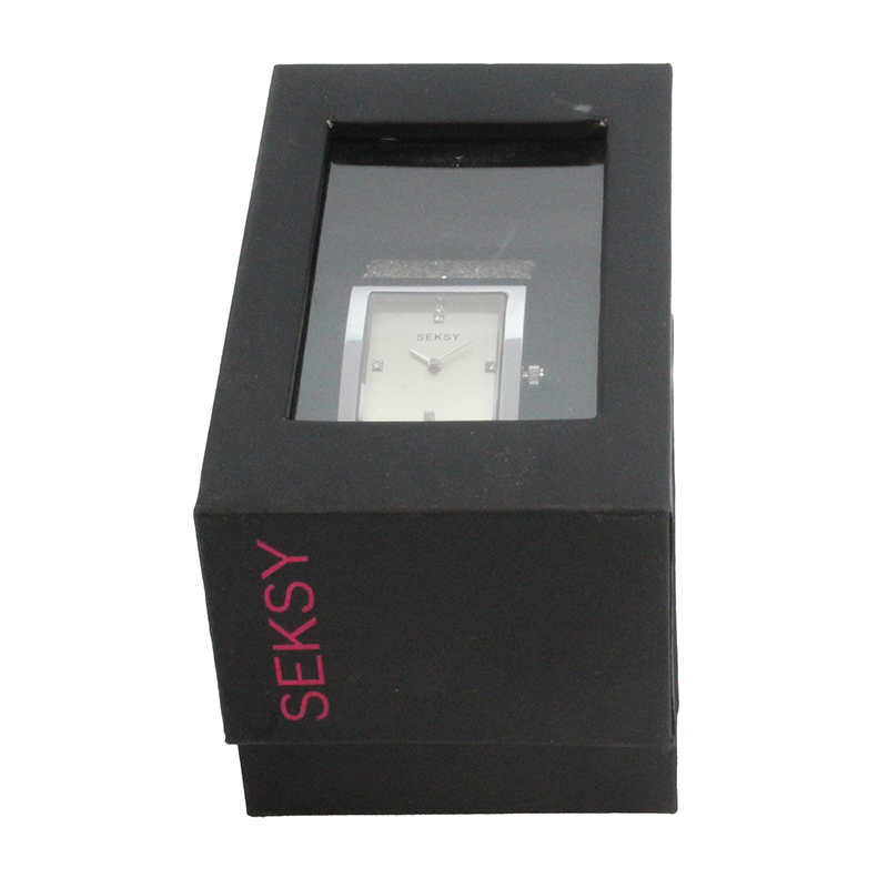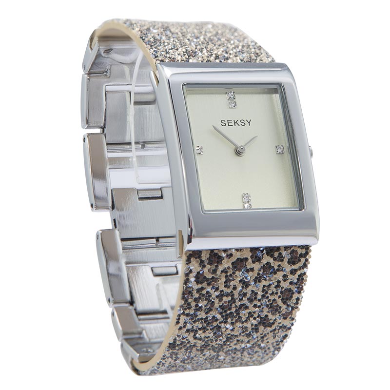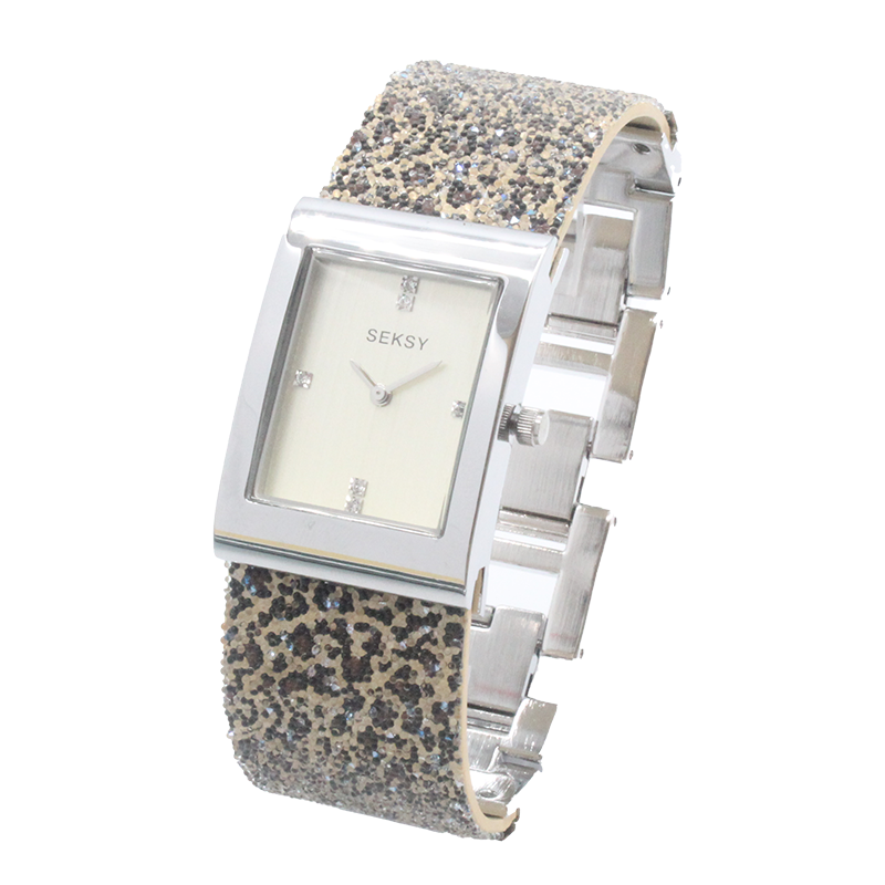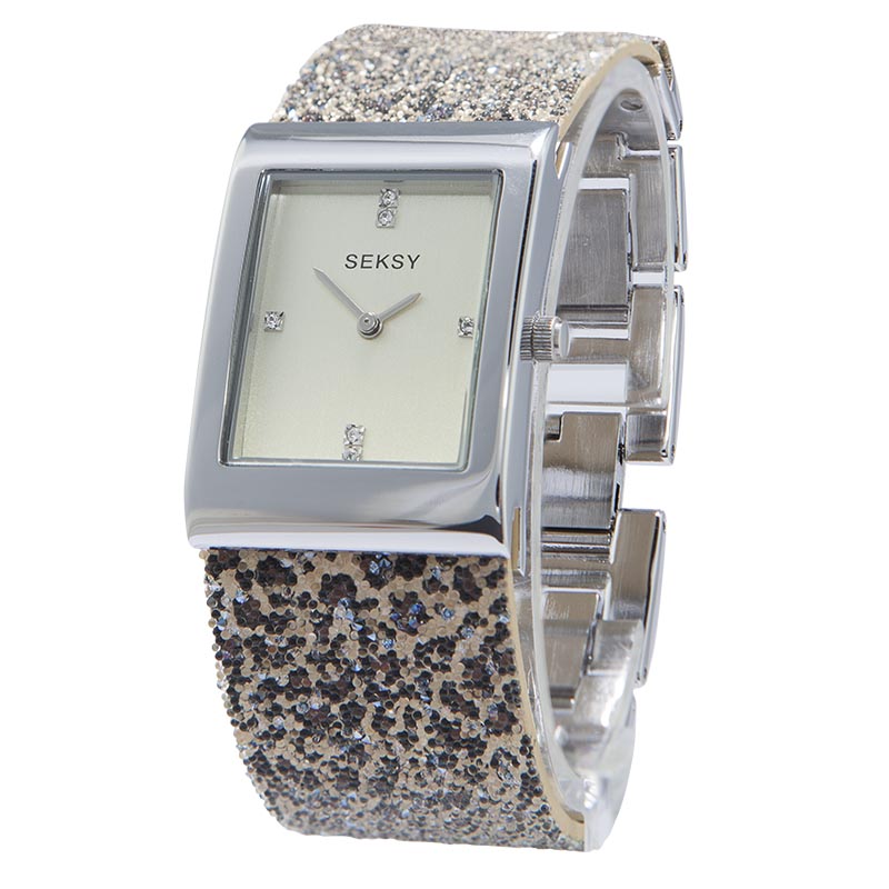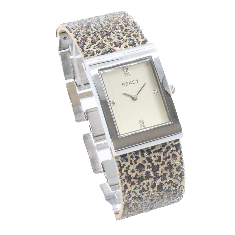 A stylish watch with a rectangular silver coloured case & champagne stone set dial with silver coloured bracelet and beige leather leopard print strap from Seksy.