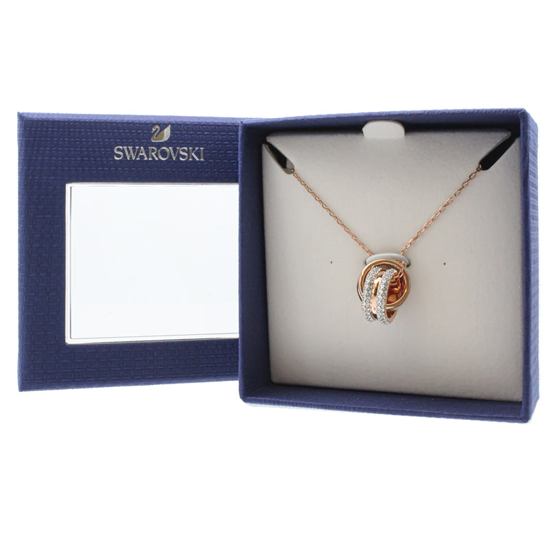 Experience the refined elegance of the Swarovski Further Rose Gold Pendant Necklace. This piece features a sophisticated interlocking loop design, embellished with brilliant white crystals that capture and reflect light beautifully. Crafted with a rose gold tone plating, it brings a touch of modernity to timeless elegance.