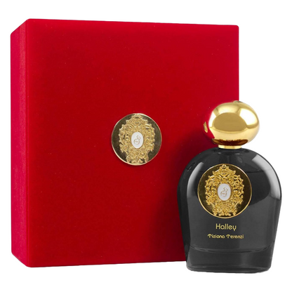 Honouring Halley's Comet, Tiziana Terenzi's fragrance begins with passion fruit, lemon, black currant, and Bulgarian rose. It evolves with peach, cinnamon, and raspberry, culminating in vanilla, cedarwood, amber, and musk. A seductive masterpiece